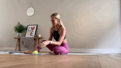 ◆ 屈膝坐立姿势,把网球放在左臀下方;